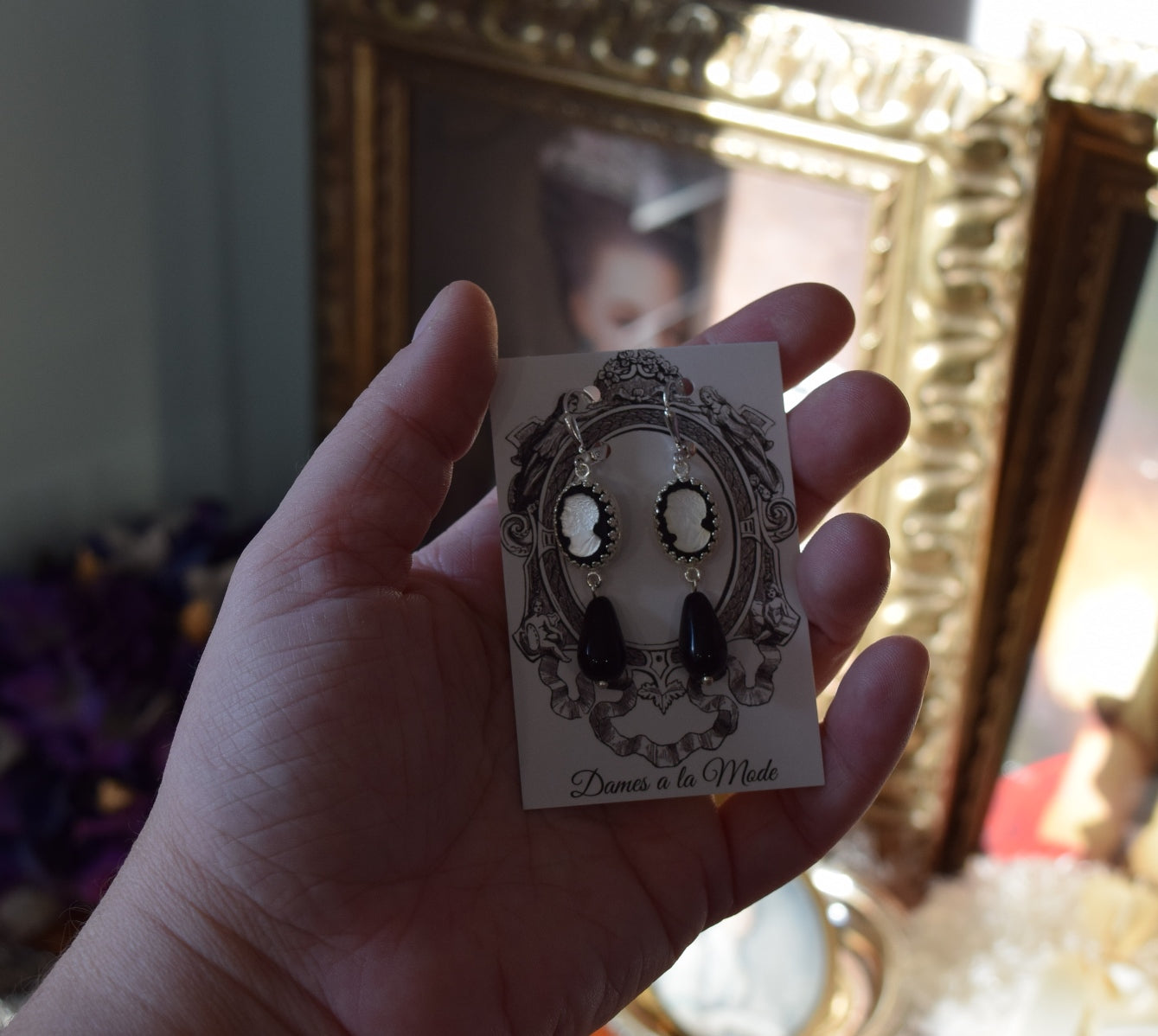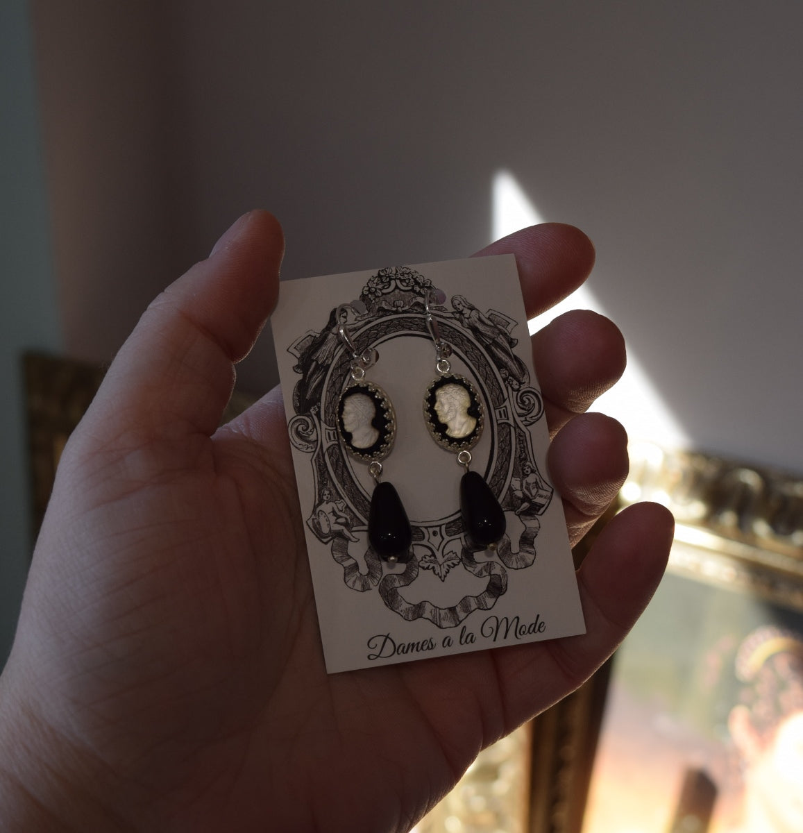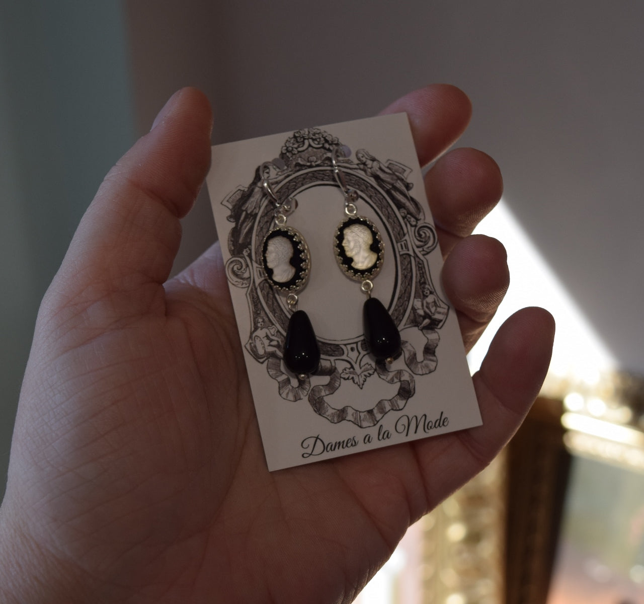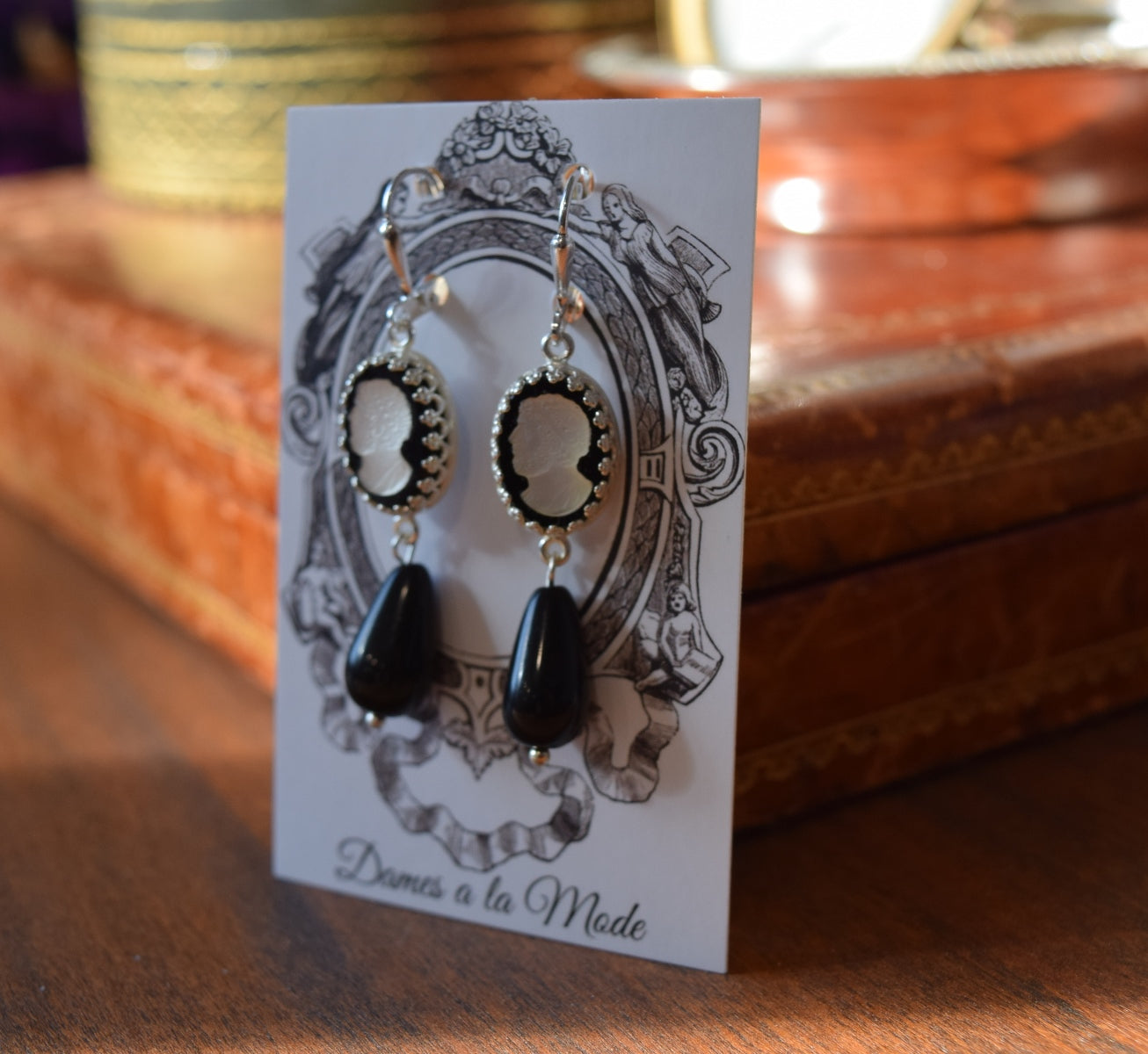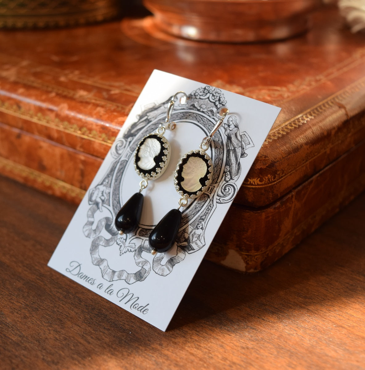 These historically-inspired earrings are made with gorgeous and unusual glass cameo stones. They have a black background with a flashing, reflective opalescent central silhouette figure.