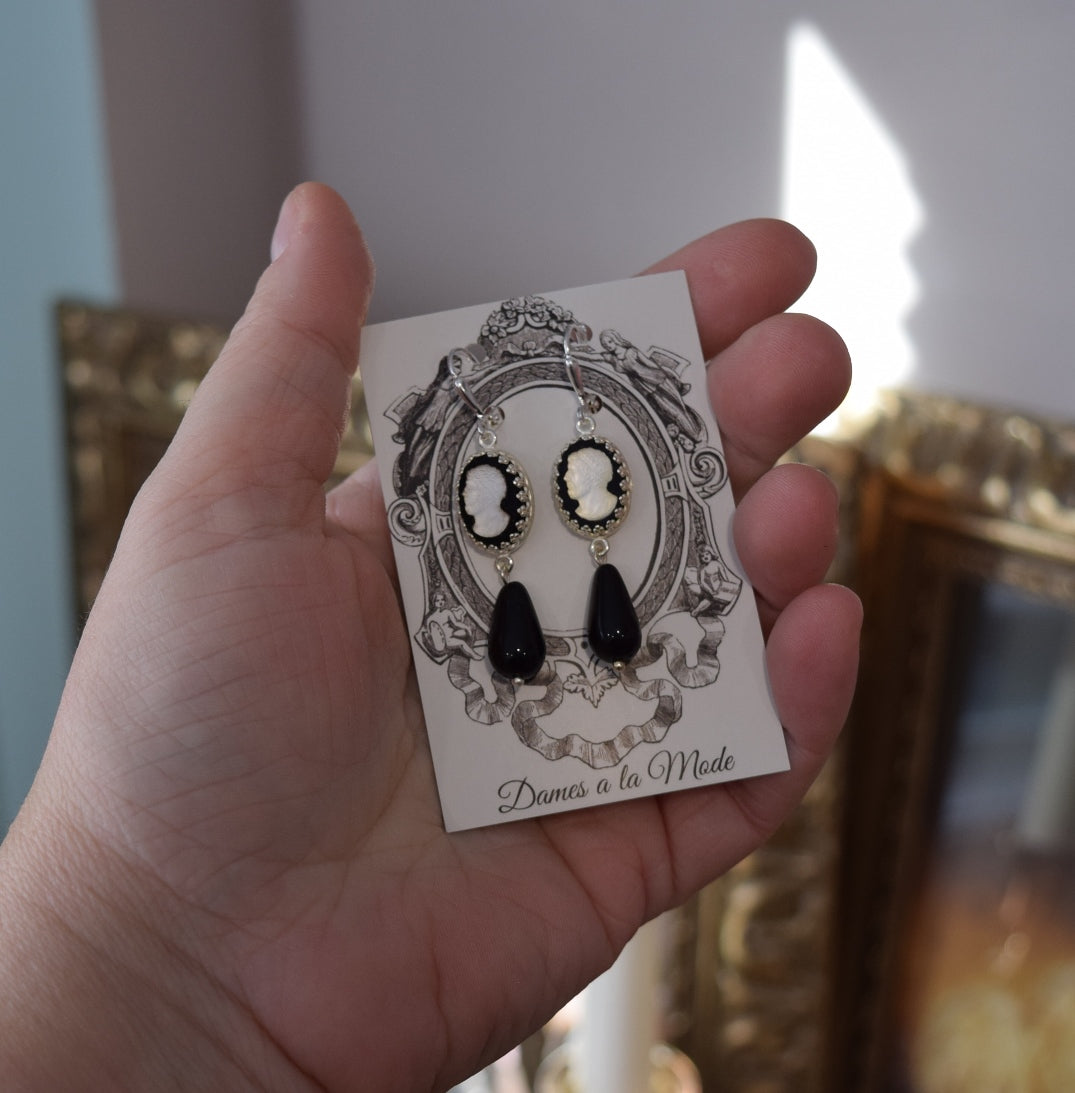 Black and White Cameo Earrings with Pearl Dangles