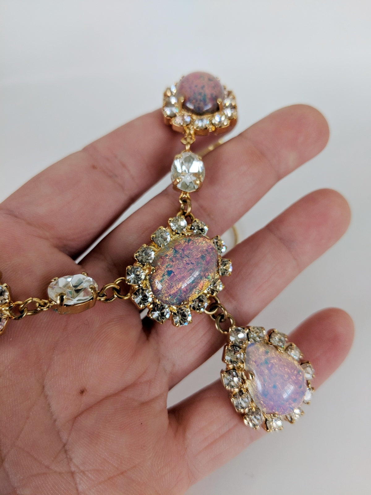 This is my large halo style necklace featuring gorgeous vintage glass opals surrounded by sparkling clear Swarovski Crystals. The photos to not do the sparkle of this necklace justice - it is eyecatching!