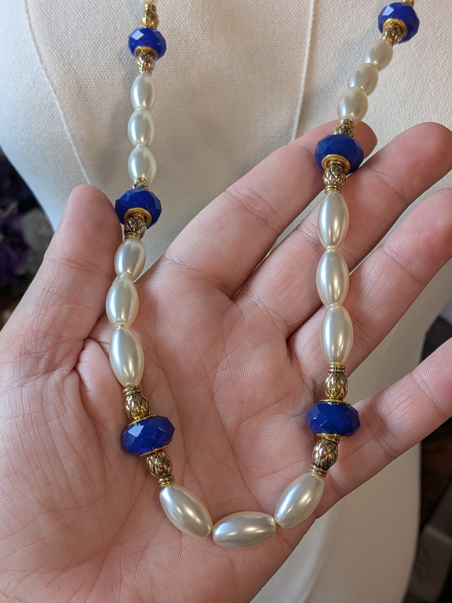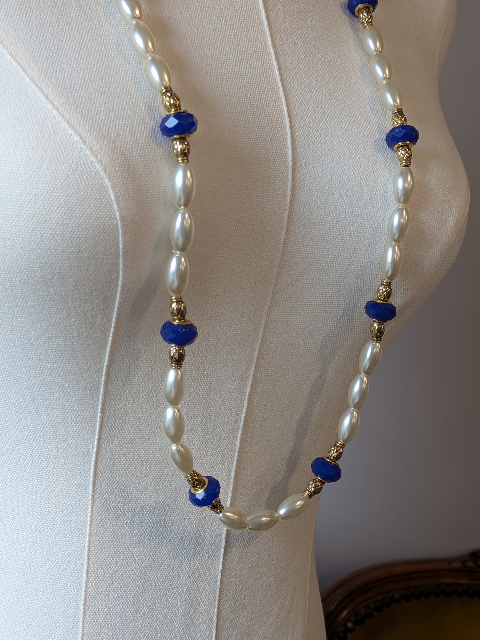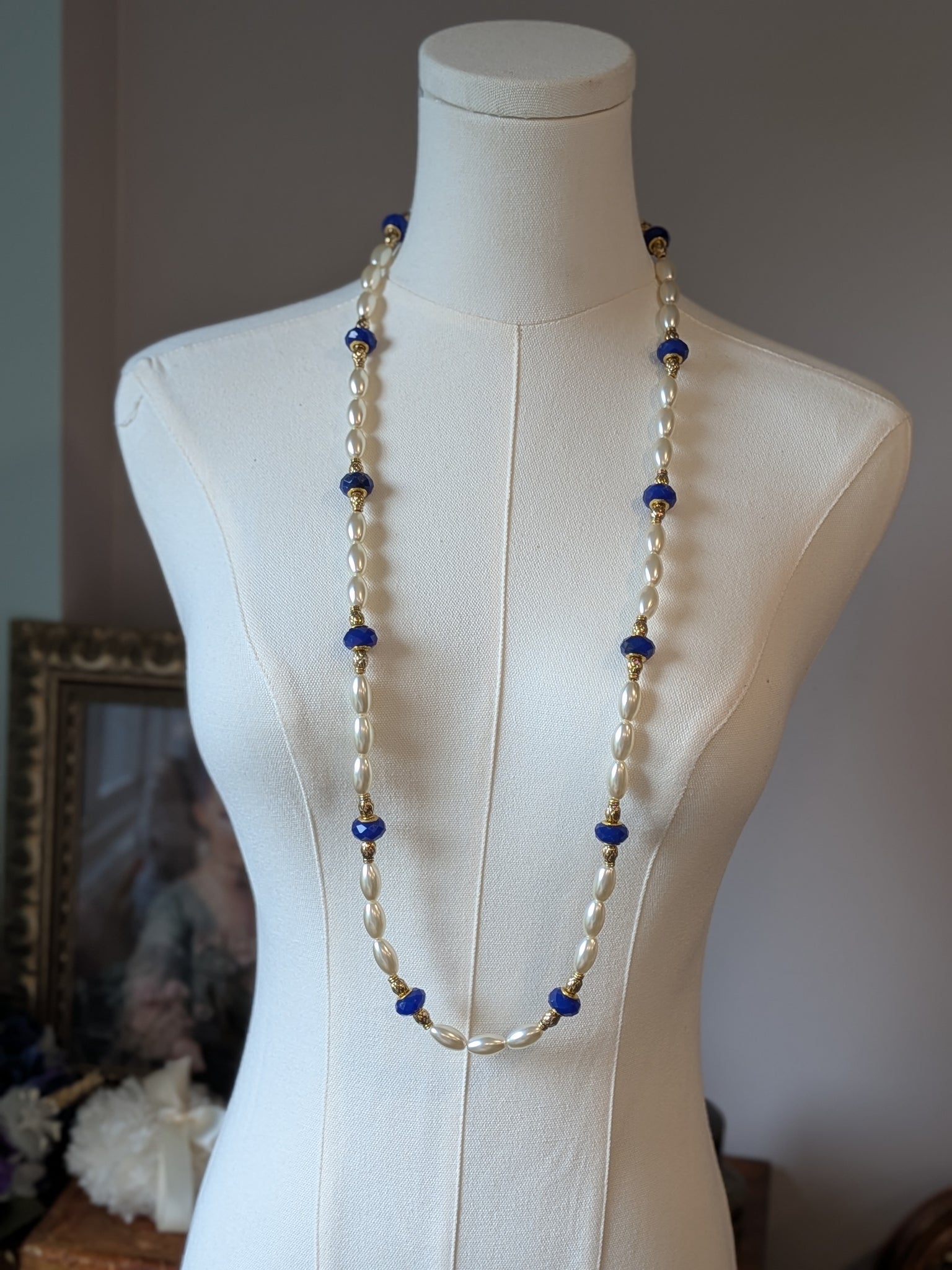 Long Renaissance Necklace - Blue, Dark Gold, and Pearl