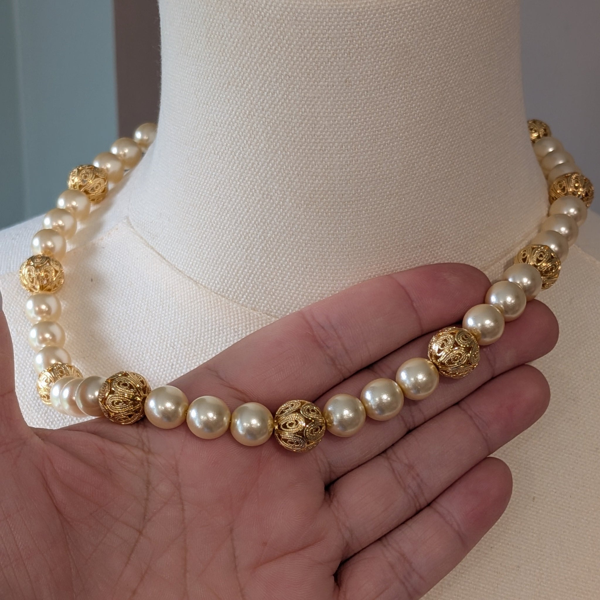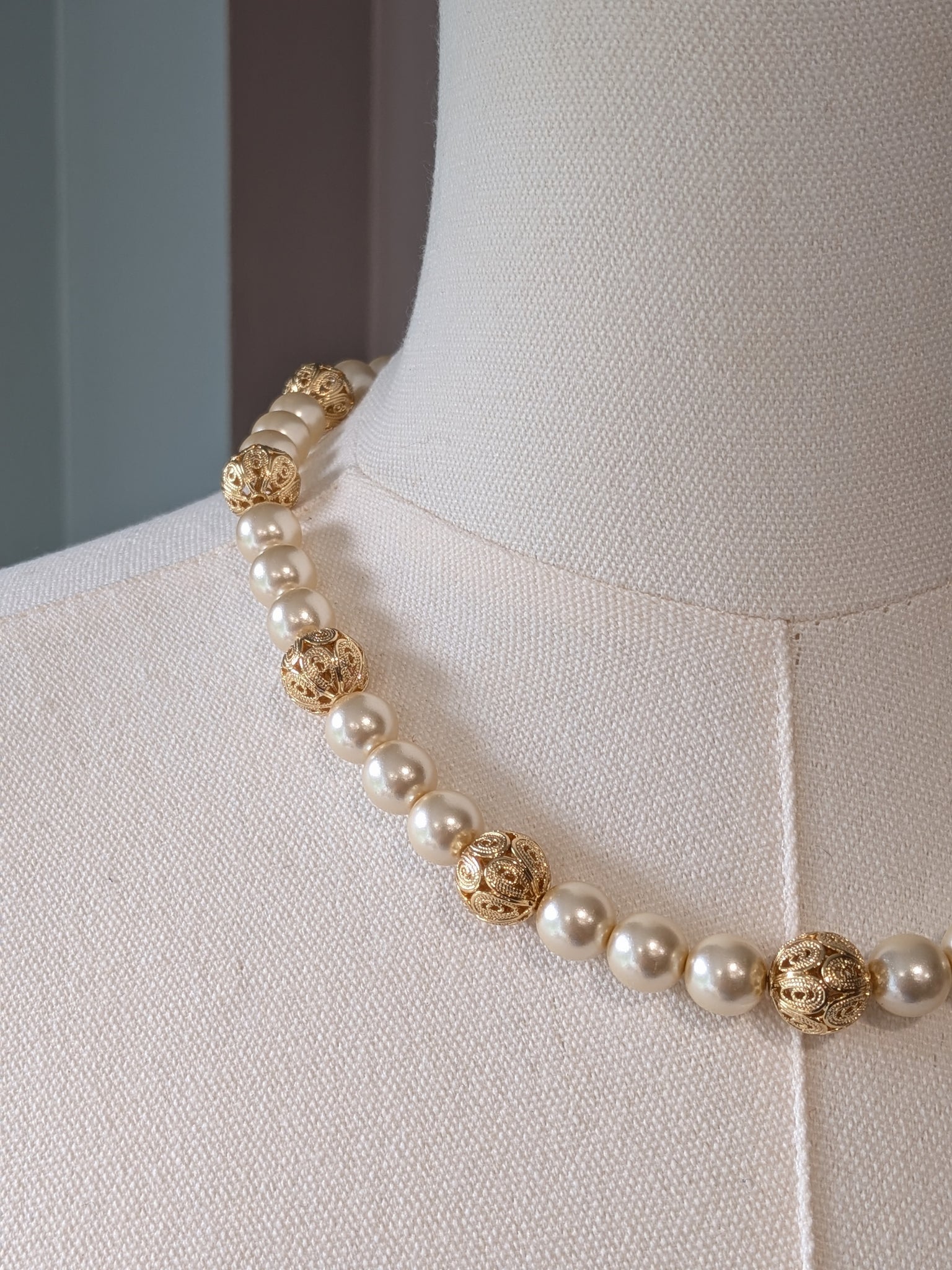 This necklace features 10mm glass pearls in a lovely cream color, interspersed with 12mm Gold-plated filigree beads.