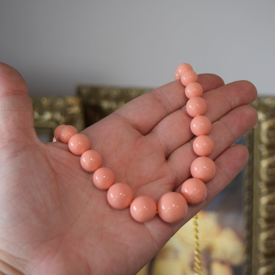 These lovely beads are a blushing coral pink color and are made from Shell Pearls, so they have wonderful weight to them!