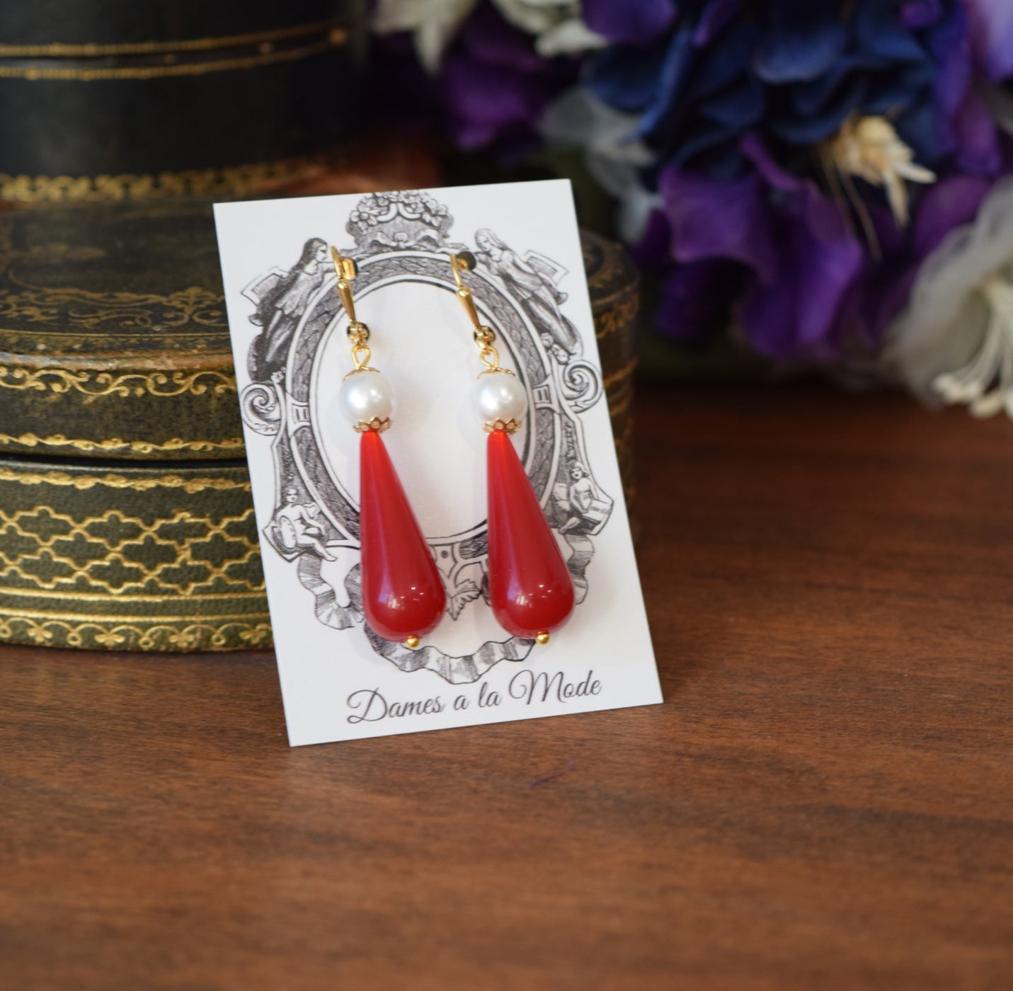 It features glass pearls and vintage acrylic red teardrops. The total length is about 2.5"