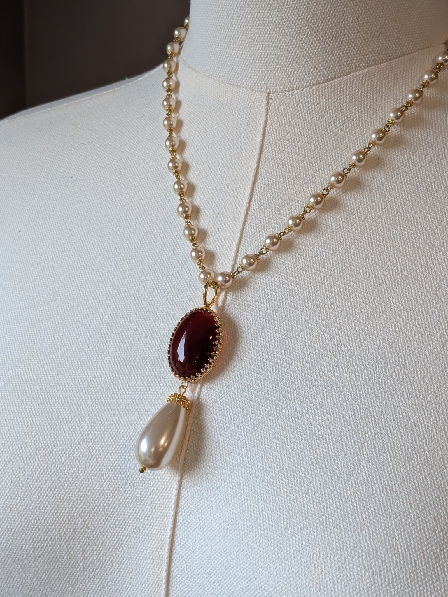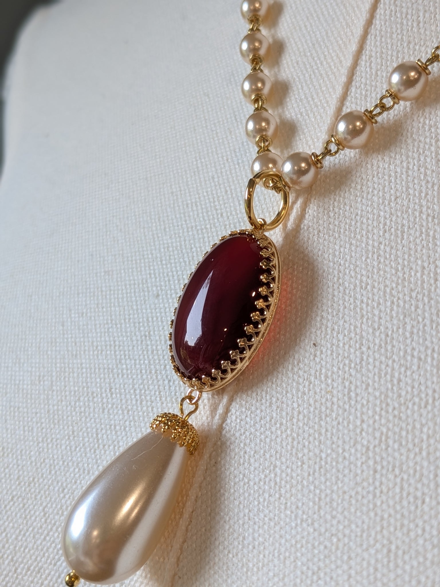 Vintage glass pearl chain (18-20" long) with a genuine Carnelian pendant with faux pearl dangle.