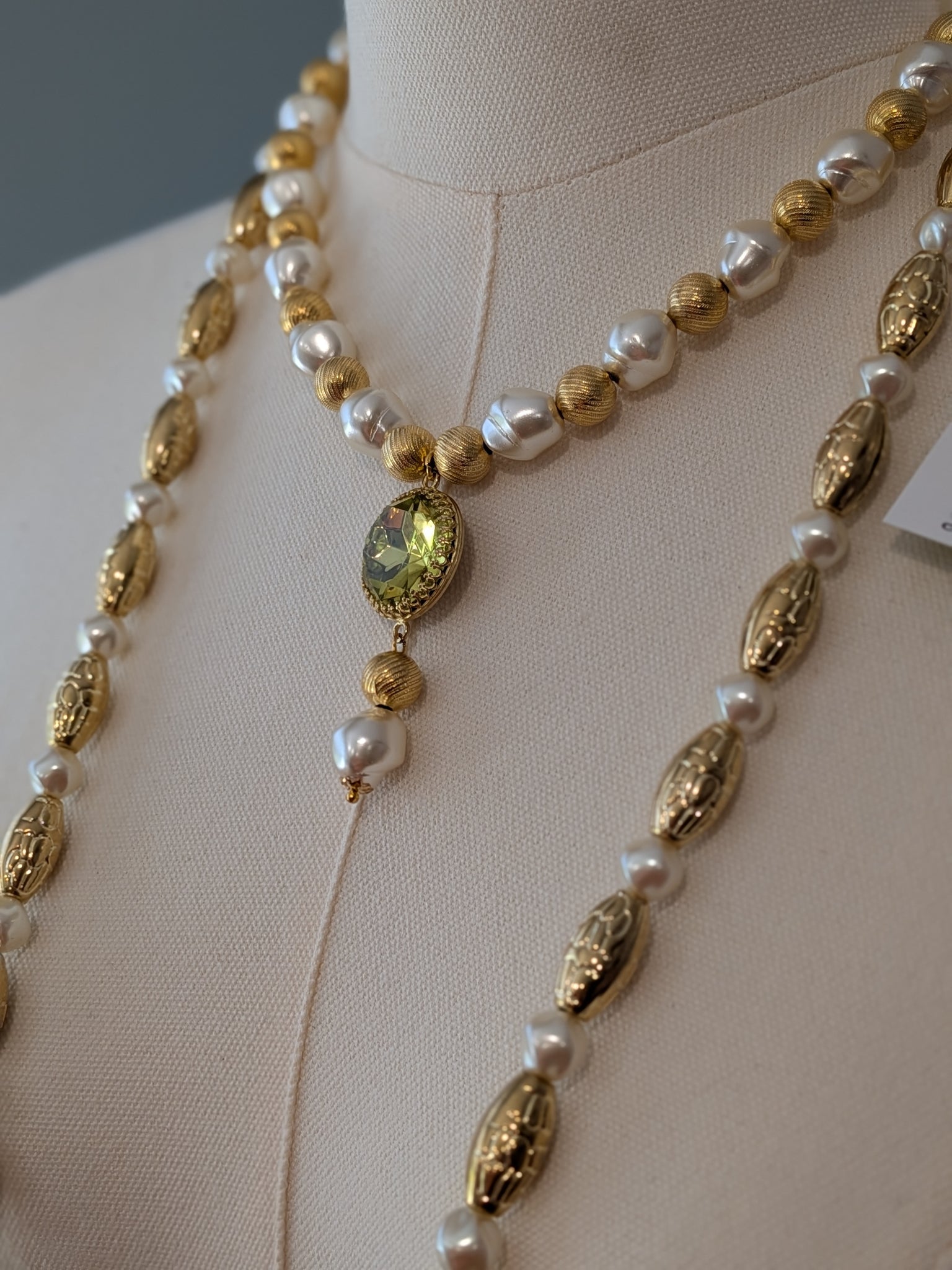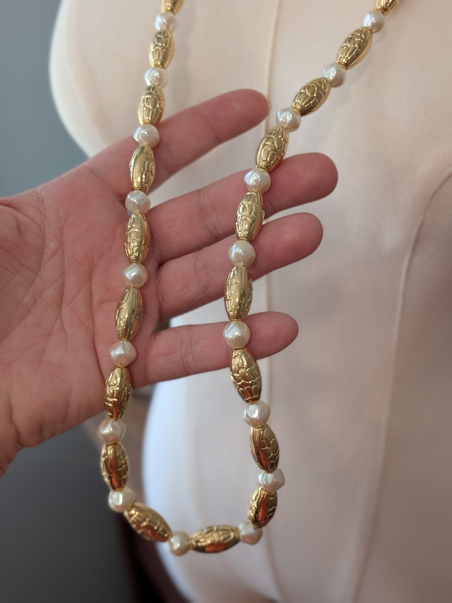 Long gold bead and white pearl necklace (40" long - can also be worn doubled to make two shorter necklaces).