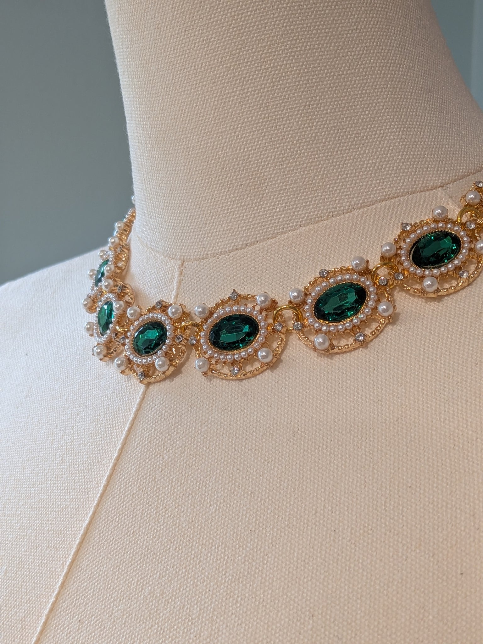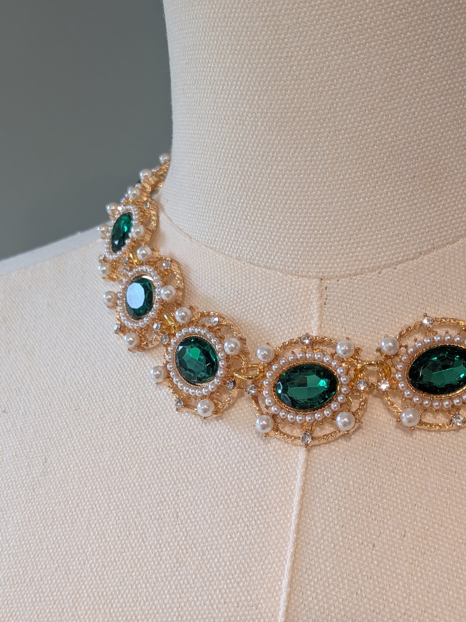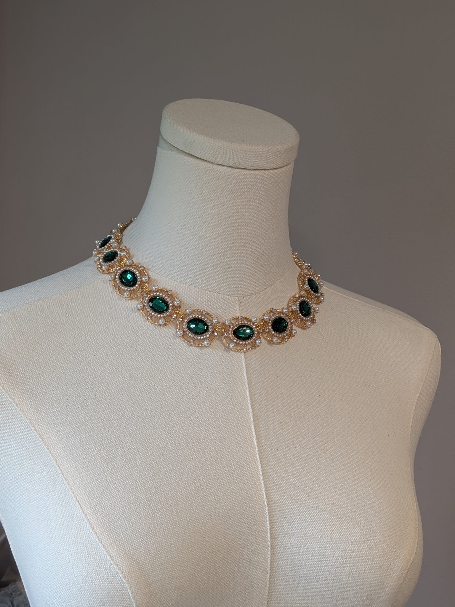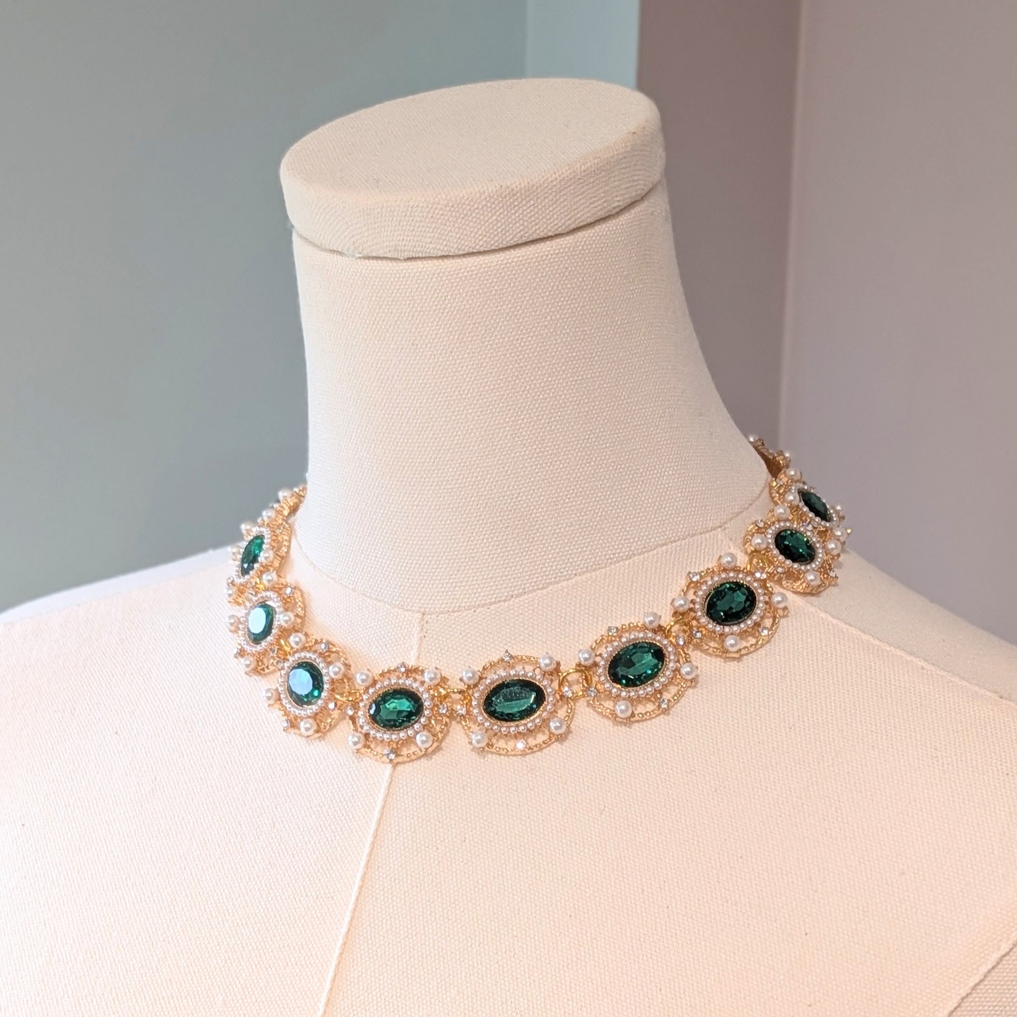 This impactful necklace is made with large lozenge elements featuring acrylic Emerald stones, crystals, and seed pearls.